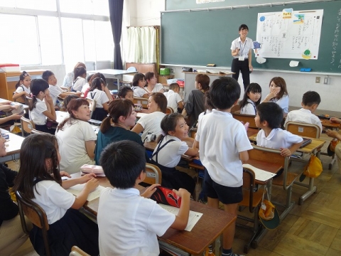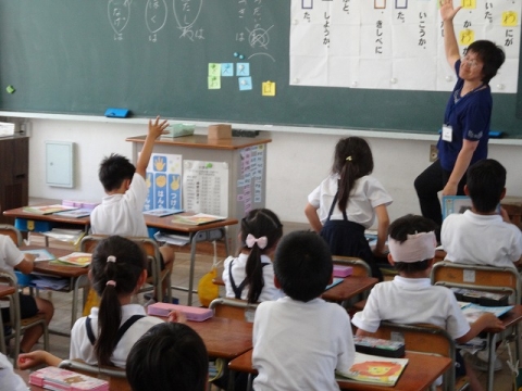 授業参観では、1年生は、国語科「『は』『を』『へ』を使おう」
