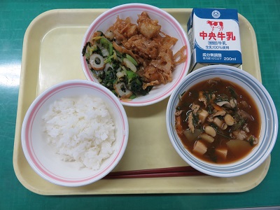 ごはん、牛乳、サメとれんこんのレモンソース、小松菜の和え物、呉汁