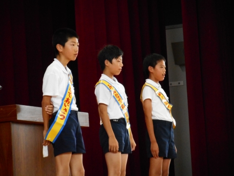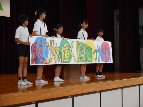朝礼で、校長先生のお話の後、児童会から今年の運動会のテーマの発表がありました。