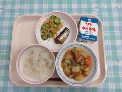 ごはん、牛乳、肉じゃが、鰯の梅煮、切干大根の和え物