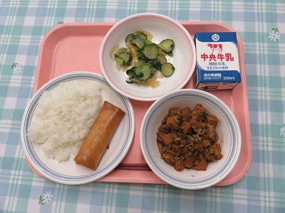 ごはん、牛乳、生揚げの中華炒め、愛知の野菜春巻き、糸寒天の黒酢漬け
