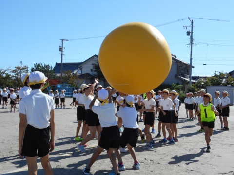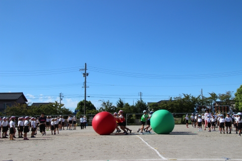1周目は、全学年、大玉を転がします。2・3周目は、1年生から3年生までは、同様に大玉を転がし、4年生から6年生は、大玉を頭上に持ち上げて送ります。これがなかなか思うように行かず、どの色も苦戦していました。