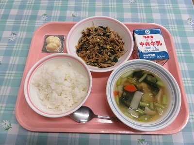 ごはん、牛乳、ビビンバの具(肉いため、ナムル)、中華スープ、型抜きチーズ