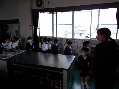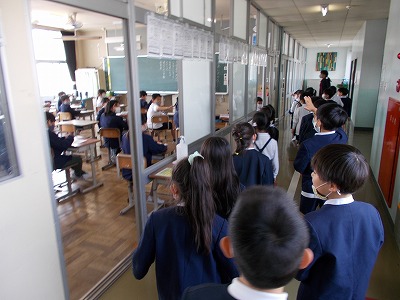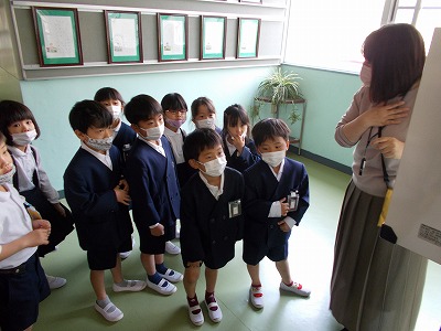 今日は1年生が生活科の授業で学校探検を行いました。担任の先生の引率で、職員室や特別教室などを見て回りました。初めて見る校内の様子に、みんな興味津々でした。