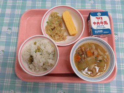 枝豆ごはん、牛乳、冬瓜のうま煮、卵焼き、キャベツとツナの和え物