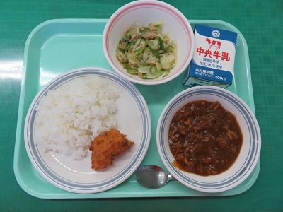 ハヤシライス(ごはん、ルウ)、牛乳、手作り豆腐ナゲット、グリーンサラダ