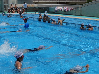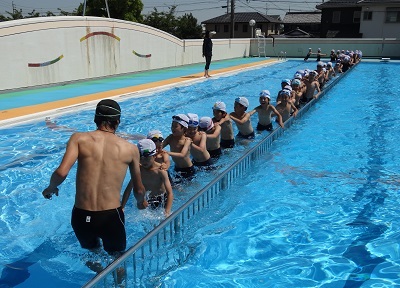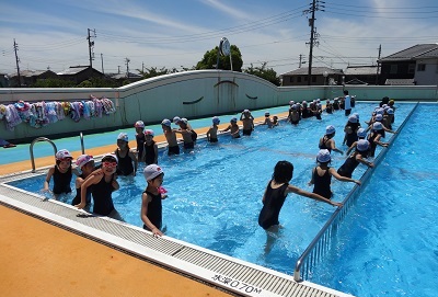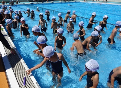 14日はプールびらきでした。時間割の関係で、14日に5つの学年が、15日に1つの学年が、今年初めて水泳の授業を行いました。はじめに先生から安全に授業を行うための注意事項を聞き、準備運動を行ったあとプールに入りました。待ちに待った水泳の授業に子どもたちは「楽しい」「気持ちいい」と大喜びで歓声を上げていました。