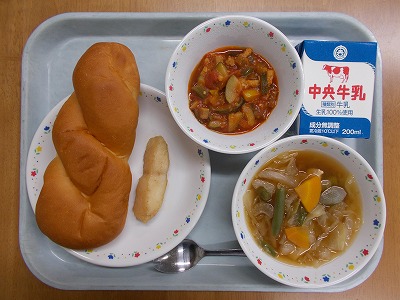愛知のツイストロールパン 牛乳 白身魚の香味焼き ラタトゥイユ コンソメスープ