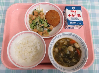 ごはん、牛乳、えびカツ、生揚げと青菜の和え物、あおさ入り白みそ汁