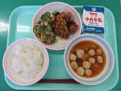 今日は、「かみかみ献立」です。よくかんで食べることができるように、豚肉とれんこんを揚げて、かみ応えがあるように調理しました。