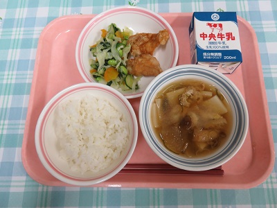 ごはん、牛乳、鶏肉のレモンソース、即席漬け、冬瓜汁