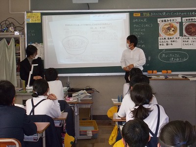 今日は5年生で家庭科の研究授業を行いました。担任の先生と栄養教諭の先生の二人で、野菜を多く取り入れた「わが家のとっておきみそ汁」を考える授業を行いました。