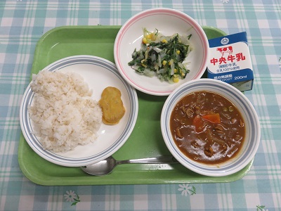 麦ごはん、牛乳、カレーライス(ルウ)、鯖ナゲット、水菜のイタリアンサラダ