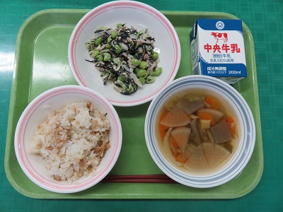 フレークごはん、牛乳、ひじきの和風サラダ、具沢山汁