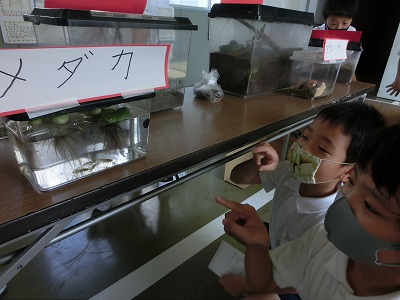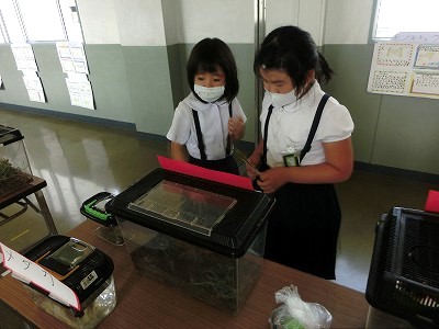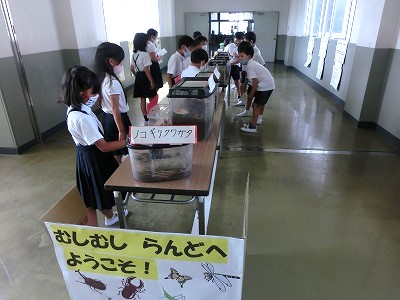 2年生が1年生に生き物の紹介をする生活科の授業「むしむしらんど」が行われました。2年生は前日までにバッタやカブトムシ、ダンゴムシ、ザリガニ、メダカなどを用意し、それぞれの生き物について説明する掲示を書いたり、1年生に渡す招待状を作ったりしました。当日は、2年生が1年生を「むしむしらんど」に案内し、説明を読んであげたり、実物を見ながら説明してあげたりしました。1年生は目を輝かせて生き物を観察し、終わった後は「すごかった!」「おもしろかった!」とうれしそうに話していました。むしむしらんどへようこそ!ダンゴムシ…どこにいるのかな?ほら、メダカがいるよ!