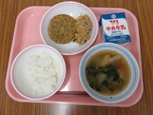 ごはん、牛乳、愛知県産大豆と豆腐のフライ、切干大根のミルク煮、冬瓜汁