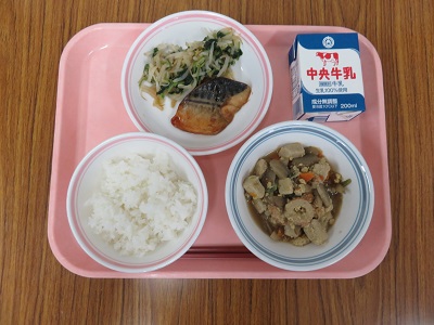 ごはん、牛乳、高野豆腐の卵とじ、鯖の紀州漬け、愛西三つ葉の和え物