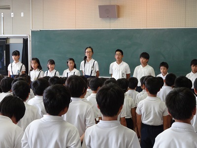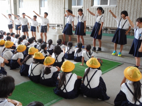 全校児童が、赤、青、黄、緑の4ブロックに分かれて集まりました。