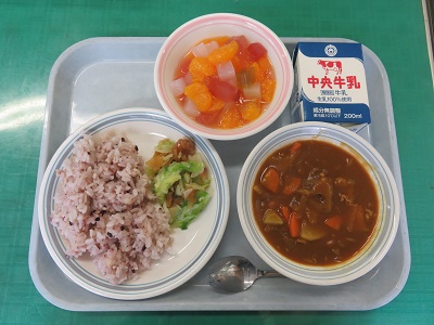 五穀ごはん、牛乳、愛西カレー、福神和え、いちじくゼリーポンチ