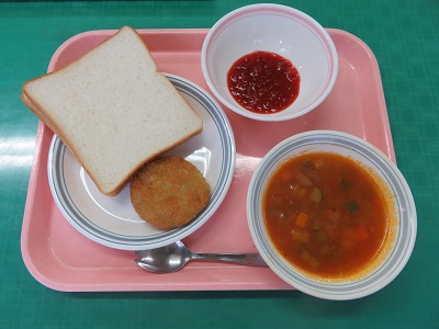 スライスパン、牛乳、手作りいちごジャム、キャベツ入りミンチカツ、ミネストローネ