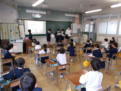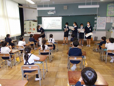 給食の食器や牛乳パックをきれいに片付ける意識を高めるため、給食委員会が呼びかけを行いました。今日は給食委員が1年生の教室を訪れ、調理員さんたちが実際に食器を洗ったりワゴンの消毒を行ったりしている動画を見せて、調理員さんたちのためにもきれいに片付けよう、という呼びかけを行いました。