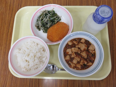 ごはん、牛乳、麻婆豆腐、コーンコロッケ、もやしの香り和え