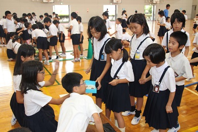 今日の昼休み、体育館に4年生と1年生が集まりました。飼育委員会の企画で、学校で育てているうさぎや他の生き物についてのスタンプラリーに参加するためです。1・4年生がペアやグループになり、協力してクイズを解く姿が見られました。最後のゴールでは、動物のイラストをもらって喜んで帰っていきました。