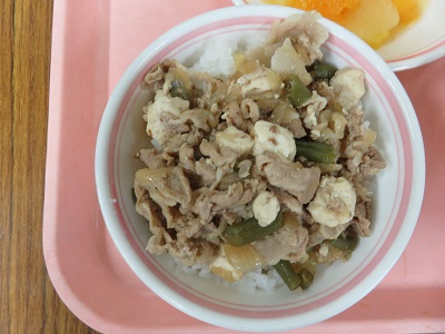 肉豆腐丼は人気の献立です。青みにピーマンやねぎを入れますが、肉と豆腐と一緒に食べるので、苦手な子も食べられるようです。今日はいんげんを使いました。