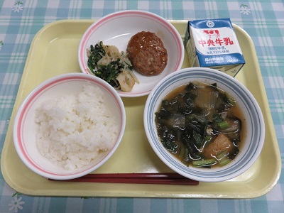 ごはん、牛乳、和風ハンバーグ、ほうれん草のごま和え、里芋のみそ汁