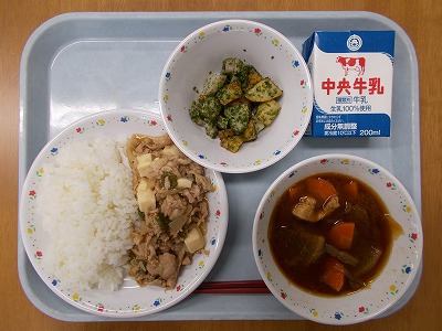 ご飯 牛乳 肉豆腐丼 海苔塩ポテト 根菜たっぷりみそ汁