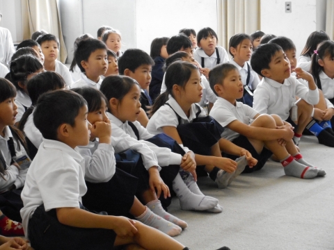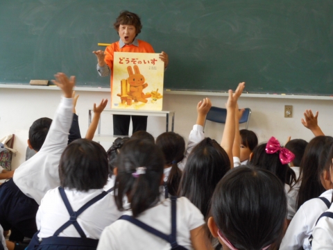 1冊目は、『どうぞのいす』。 お話を知っているという児童もいましたが、大型絵本で読み聞かせていただくのは、また格別のようでした。