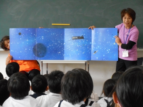2時間目の休み時間に、1年生が読み聞かせグループ「まつぼっくり」の方々に読み聞かせをしていただきました。