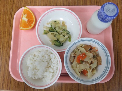 ご飯、牛乳、揚げじゃがいものそぼろの煮、キャベツのあっさり漬け、オレンジ