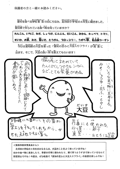 4年生が大豆の紹介をしてくれています。大豆を使った献立が登場します。