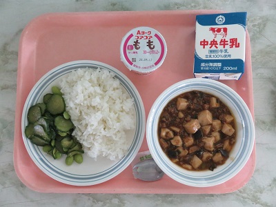 ごはん、牛乳、麻婆豆腐、きゅうりのピリ辛和え、フルーツヨーグルト