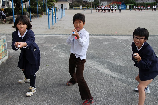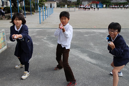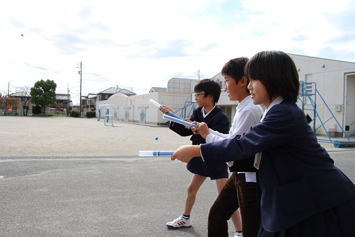 理科の学習で、4年生が外で実験をしていました。空気でっぽうを使い、筒の中の空気が縮み、先に付けてある固いスポンジが押し出されるという実験です。