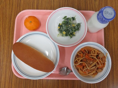 小型ロール、牛乳、スパゲッティイタリアン、水菜のシャキシャキサラダ、冷凍みかん