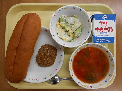 サンドイッチロールパン 牛乳 ハンバーグのテリヤキソース とうもろこしのサラダ もち麦入りミネストローネ
