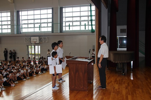 夏休みに書いた読書感想文の表彰がありました。低・中・高1名ずつの児童が表彰されました。