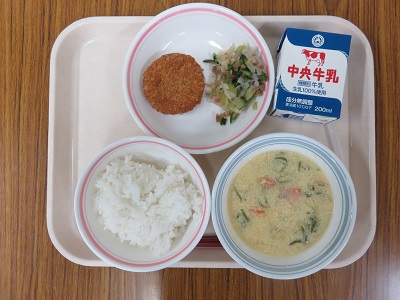 ごはん、牛乳、愛西れんこんのコロッケ、大根の梅肉和え、かき玉汁