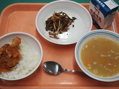 今日の献立は、チキンどん、ゴボウとゴーヤのチップス、スイートコーンスープ、ごはん、牛乳でした。