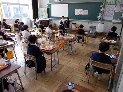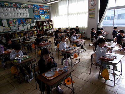 今日の1年生の給食の様子です。配膳や準備などをがんばって行っています。