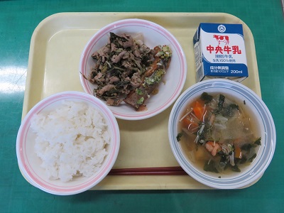 ごはん、牛乳、かつおのにんにくみそ焼き、豚肉と水菜の梅ポン炒め、愛西冬瓜とえびのすまし汁