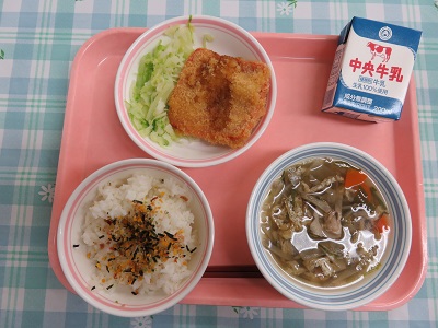 ごはん、たまごふりかけ、牛乳、手作りハムカツ、ゆでキャベツ、根菜汁