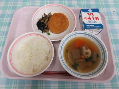 ごはん、牛乳、キャベツ入りミンチカツ、ひじきのいため煮、鶏肉と根菜のかみかみ汁