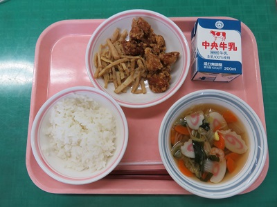 ごはん、牛乳、鶏肉の唐揚げ、たけのこのピリ辛漬け、中華スープ