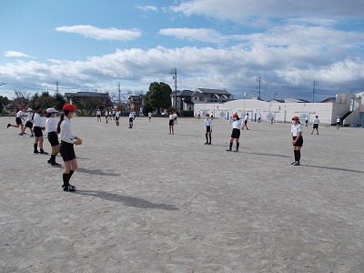 今日はソフトボールの最初の授業ということで、柔らかいボールを使ってキャッチボールを行いました。
