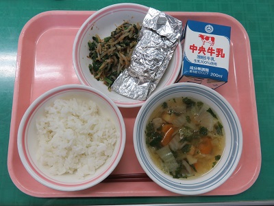 ごはん、牛乳、鯖の銀紙焼き、ほうれん草のおかか和え、野菜たっぷり汁