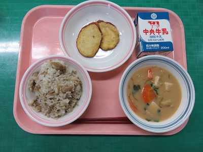 ごはん、牛乳、ツナときのこの混ぜごはん、さつまいもの天ぷら、飛鳥汁