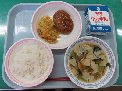 ごはん、牛乳、ハンバーグ和風ソース、だいこ~んイタリアンきんぴら、ゆばのすまし汁